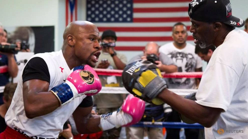 Chú cháu nhà Mayweather gồm Roger (phải) và Floyd tập luyện