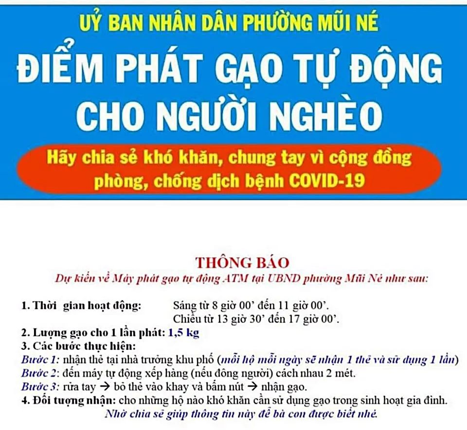 Trao đổi với PLO, ông Nguyễn Văn Vũ, Chủ tịch UBND phường Mũi Né, cho biết xuất phát từ tình cảm quê hương, một nhóm các bạn trẻ gốc Mũi Né làm việc tại TP.HCM đã đề xuất lắp máy phát gạo tự động đồng thời hỗ trợ ban đầu 10 tấn gạo.