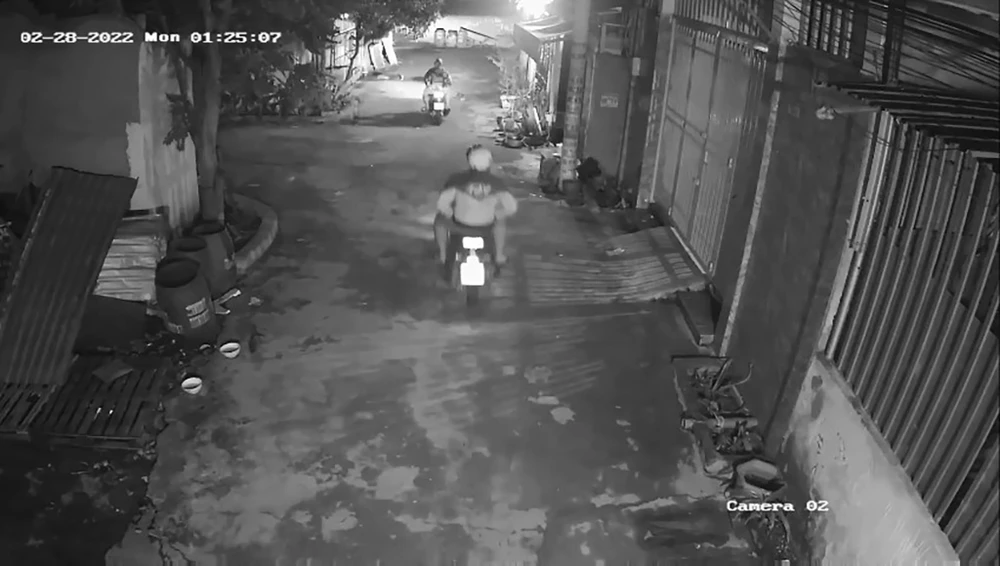 Nhóm sáu thanh niên đi xe máy đến nhà của chị N để bắt trộm gà. Ảnh chụp từ clip