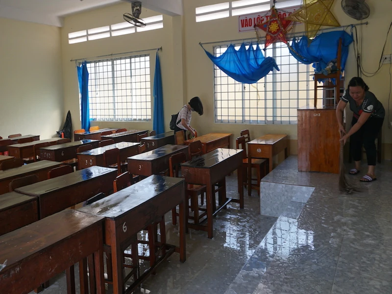 Vệ sinh trường lớp phòng, chống dịch Corona ở Vĩnh Long. Ảnh: Hải Dương