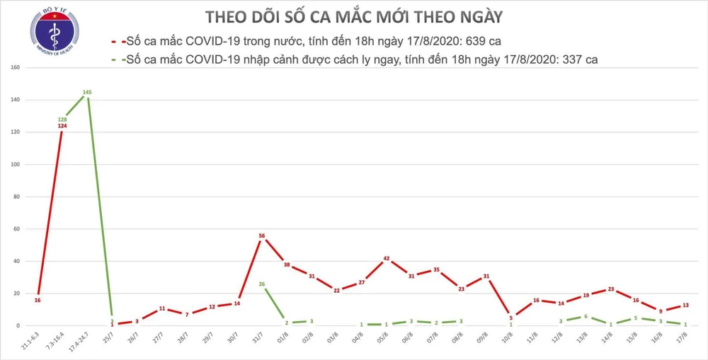 Bản tin chiều 17-8 thông tin về 12 các ca mắc mới (BN 965-976), trong đó 11 ca cộng đồng (Đà Nẵng: 6, Hải Dương: 4 và Hà Nội: 1) và 1 ca nhập cảnh, được cách ly ngay tại Hà Nội (đoàn Guinea Xích đạo).