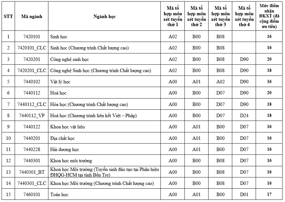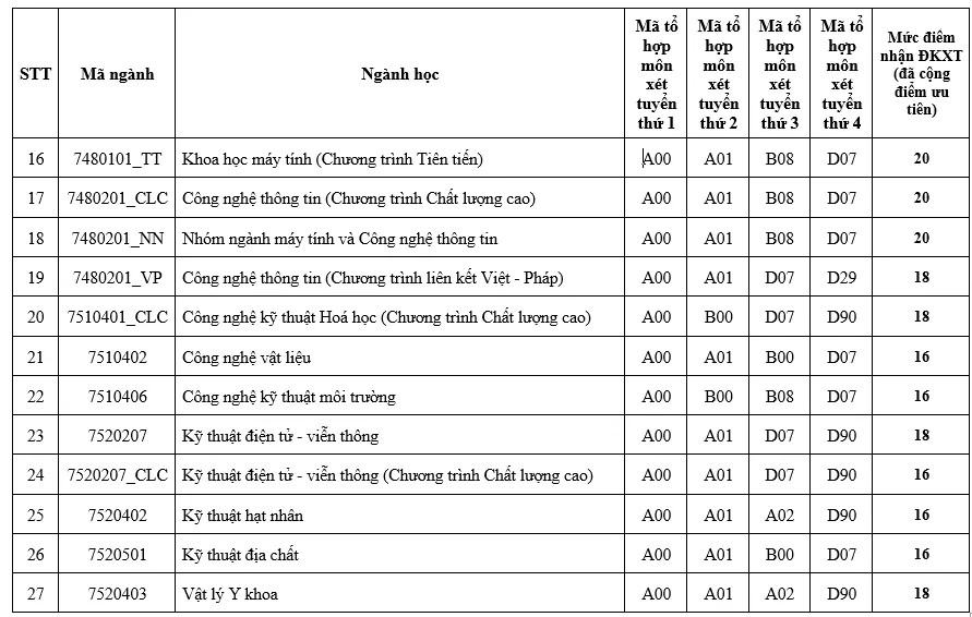 Theo đó, mức điểm sàn của trường năm nay giao động từ 16 đến 20 điểm, tùy ngành. Trong đó, cao nhất ở mức 20 điểm có đến 4 ngành, gồm: Công nghệ sinh học, Khoa học máy tính (chương trình tiên tiến), Công nghệ thông tin (hệ chất lượng cao), và nhóm ngành máy tính và công nghệ thông tin.