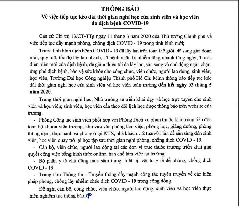 Nội dung thông báo của Trường ĐH Công nghiệp TP.HCM.