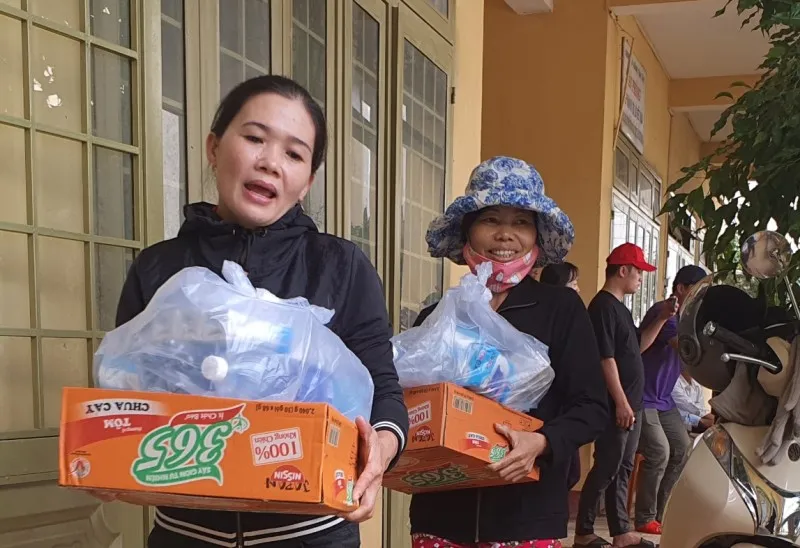 Mỗi phần quà gồm mì tôm, nước suối, sữa, băng vệ sinh và 500.000 đồng tiền mặt.