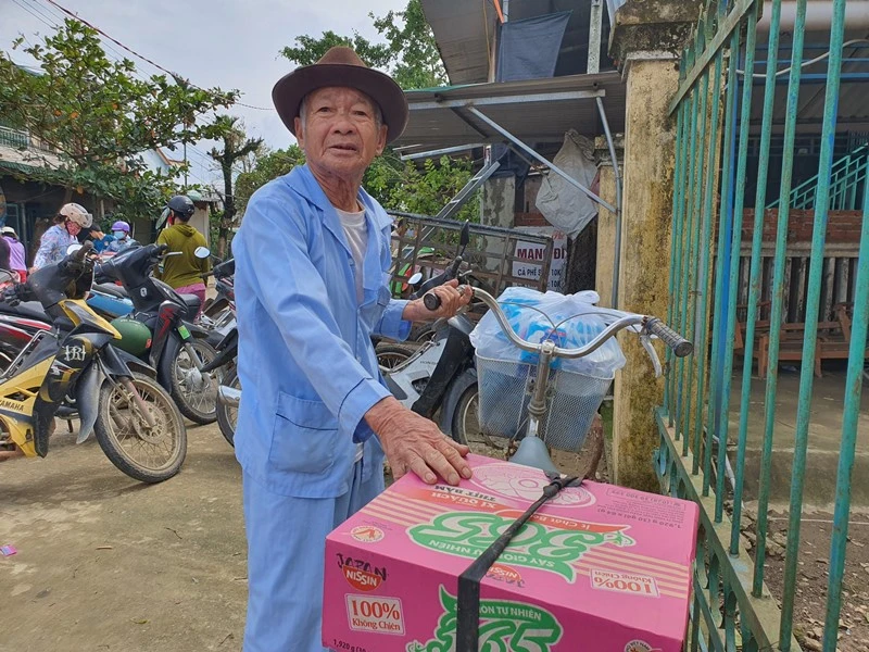 Lom khom chống gậy vào nhận quà từ báo, ông Nguyễn Lào (88 tuổi, thôn Tân Phú 1, xã Hành Tín Tây) nói trong nghẹn ngào rằng nhận gói quà này về là nhà ông đã có đồ ăn cho ông và người vợ 85 tuổi đang ở nhờ nhà hàng xóm.