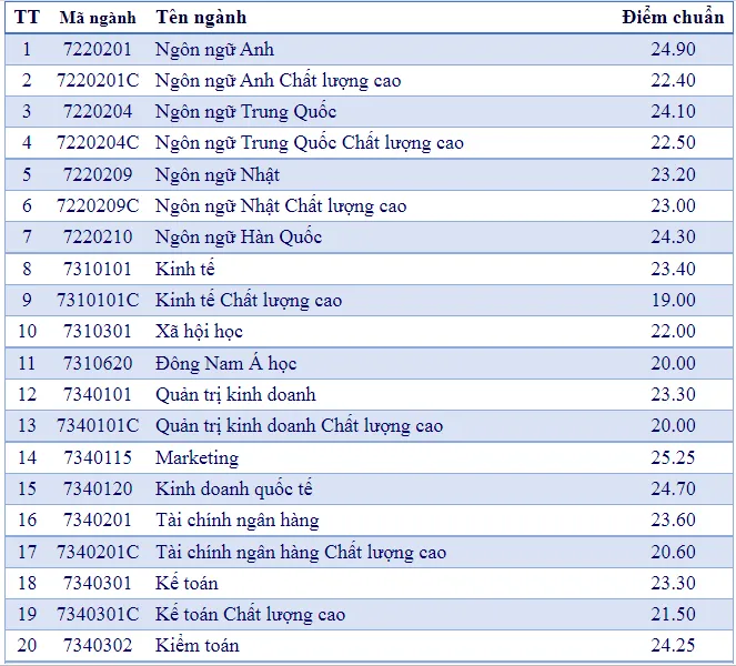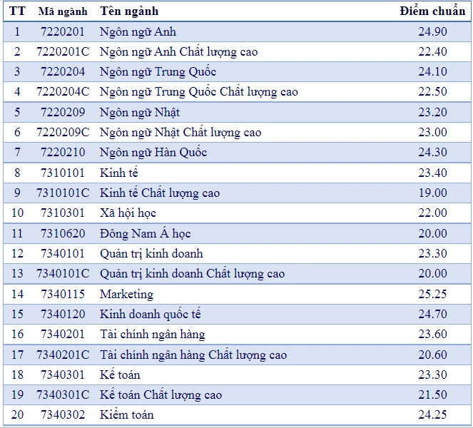 Tương tự, theo công bố của Trường ĐH Mở TP.HCM, năm nay, điểm chuẩn của trường từ 19 điểm trở lên. Nhiều ngành có điểm tổ hợp trên 24 điểm như Ngôn ngữ Anh, Ngôn ngữ Trung Quốc, Ngôn ngữ Hàn Quốc, Kiểm toán, Kinh doanh quốc tế, Marketing...