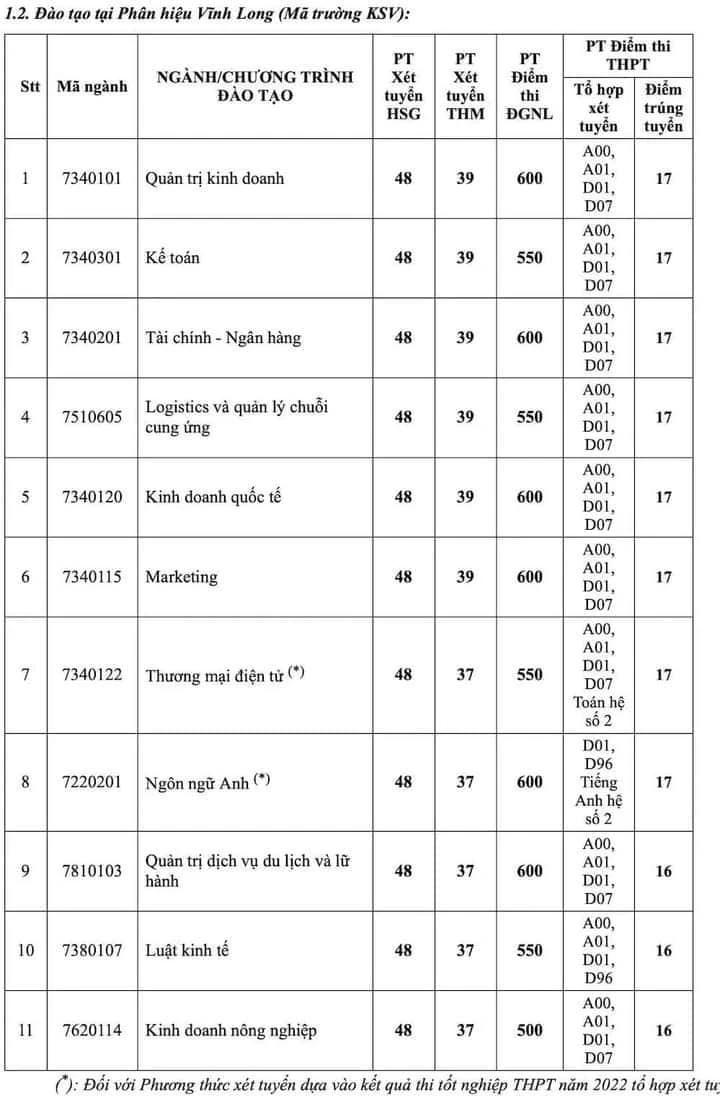 Các ngành học tại phân hiệu tỉnh Vĩnh Long cũng có điểm chuẩn đồng loạt tăng do có số thí sinh đăng ký lớn, như Logistics và Quản lý chuỗi cung ứng, Thương mại điện tử,Kinh doanh nông nghiệp, Tài chính - Ngân hàng và Kế toán.