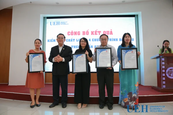 Đại diện bốn chương trình của Trường ĐH Kinh tế TP.HCM nhận chứng nhận đạt chuẩn AUN-QA. Ảnh: NTCC