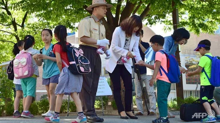 Nhân viên tại một trường tiểu học ở Seoul, Hàn Quốc phun dung dịch vệ sinh lên tay các học sinh để giảm nguy cơ nhiễm MERS . (AFP PHOTO/JUNG YEON-JE)