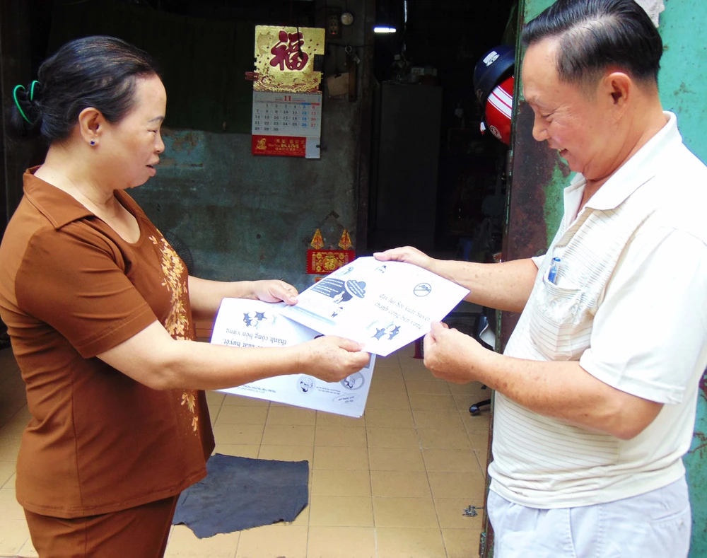 Thành viên Hội Phụ nữ phường 12, quận 11 (bìa trái) phát tài liệu và hướng dẫn một hộ dân cách tìm diệt lăng quăng trong nhà. (Ảnh chụp sáng 20-11) Ảnh: TRẦN NGỌC