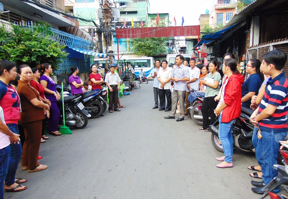 Lãnh đạo phường 12, quận 11 (TP.HCM) phân công nhiệm vụ cho từng đoàn thể tham gia tổng vệ sinh môi trường vào sáng 20-11. Ảnh: TRẦN NGỌC