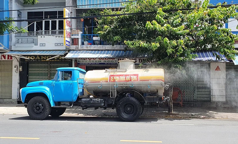 Phun hóa chất khử khuẩn trên đường phố Tuy Hòa ngày 18-7. Ảnh: TẤN LỘC