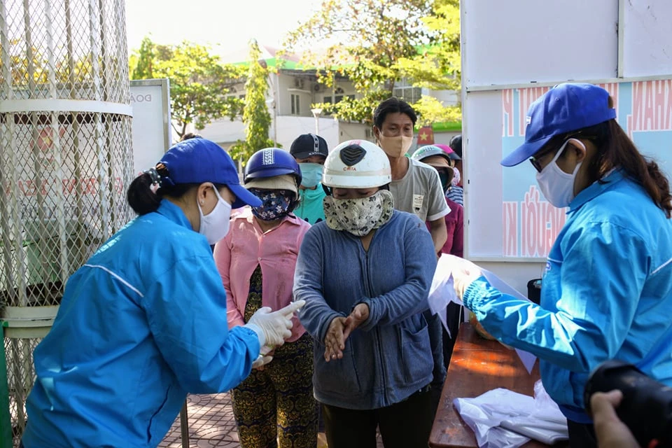 Các đoàn viên thuộc Tỉnh Đoàn hướng dẫn người dân sát khuẩn trước khi vào nhận gạo