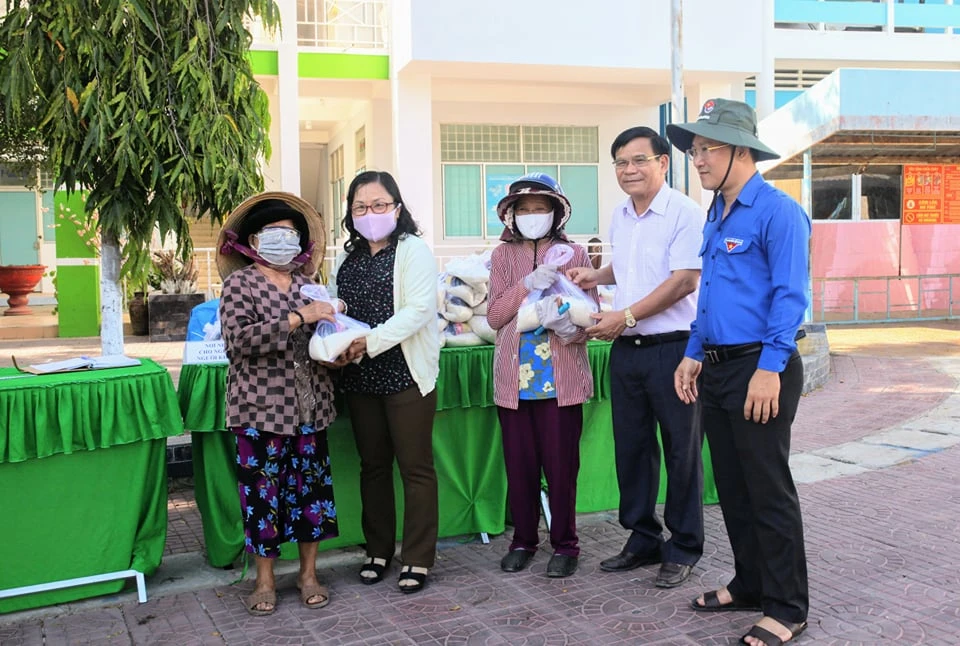Bà Trần Anh Hoàng, Phó Ban dân vận Tỉnh ủy; ông Phan Hữu Đức, Chủ tịch UBMT TQVN tỉnh và anh Nguyễn Hữu Tuấn, Bí thư tỉnh Đoàn đang phát gạo cho những người già yếu tại cây ATM gạo.