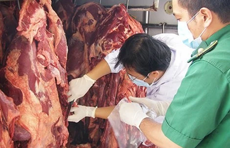 Cán bộ thú y Tp.HCM đang lấy mẫu thịt bò bơm nước để xét nghiệm. Ảnh: T.NGỌC