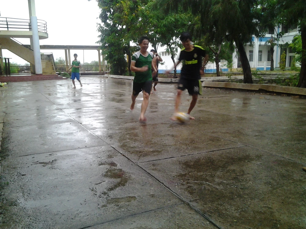 Sinh viên của trường CĐSP và ĐH Nông Lâm Tp.HCM tại Ninh Thuận cùng nhau đá banh lúc trời đang mưa