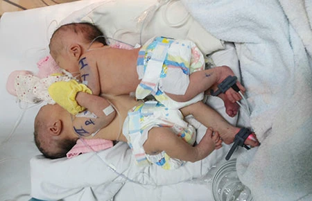 Theo BS Hiếu, các kết quả xét nghiệm, chẩn đoán hình ảnh cho thấy hai bé dính nhau phần xương ức, có lỗ thông khiến cho một phần tim của bé này chui qua ngực bé kia và ngược lại. Ngoài ra, hai bé còn mắc bệnh tim bẩm sinh. Trong đó, một bé có nhiều dị tật như không có hậu môn, động mạch tim hẹp, chỉ có một thận… Trước những bất thường lớn như trên có nguy cơ tử vong cho cả hai, BV Nhi đồng 1 sẽ tiến hành mổ tách rời cho hai bé trong thời gian sớm nhất.