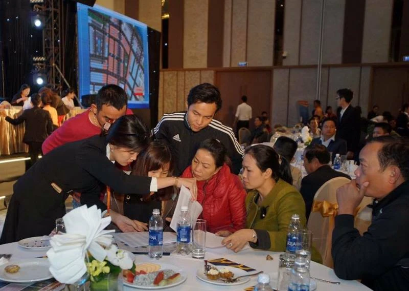Nhân viên kinh doanh của Công ty CP Địa ốc First Real tư vấn cho khách hàng tại lễ mở bán. Ảnh: TẤN VIỆT