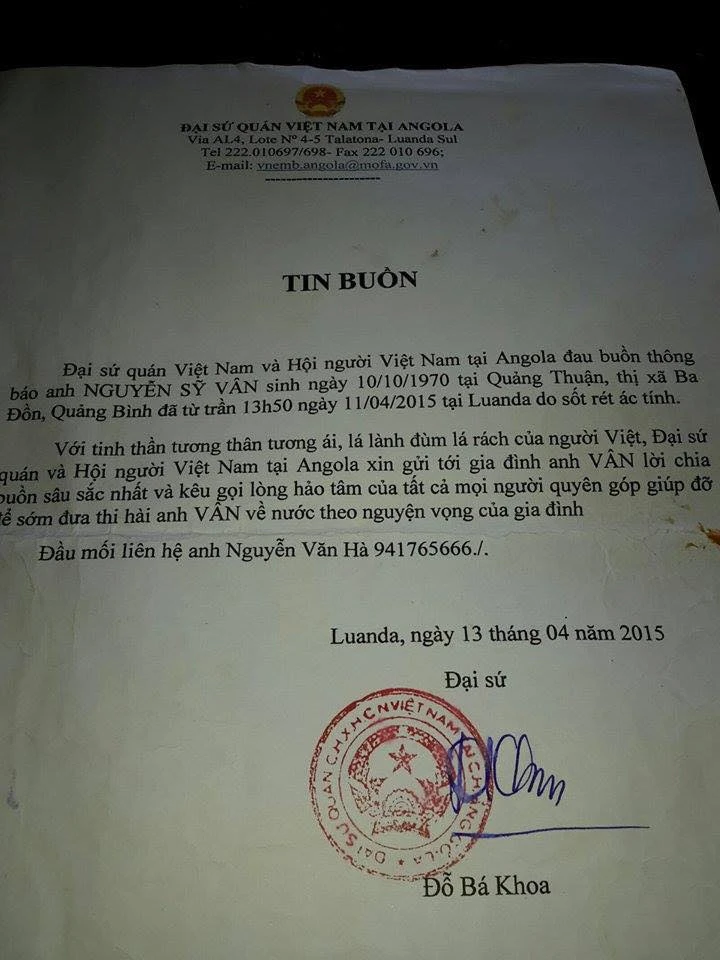 * Trước đó, ngày 13-4, Đại sứ quán Việt Nam tại Angola đau buồn, thông báo tin buồn, anh Nguyễn Sỹ Vân (45 tuổi, quê Quảng Thuận, thị xã Ba Đồn, Quảng Bình) đã tử vong ngày 11-4 tại Luanda (Angola) do bị sốt rét ác tính.