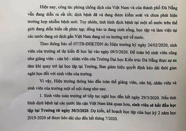 Cùng ngày, Trường ĐH Kiến trúc Đà Nẵng cũng đã thông báo tiếp tục kéo dài thời gian nghỉ đối với sinh viên đến hết ngày 29-3.