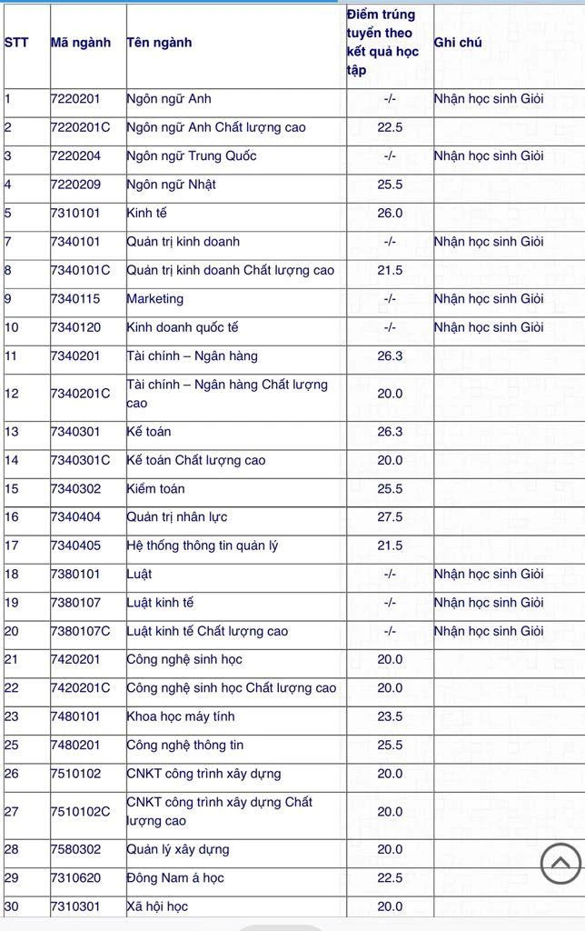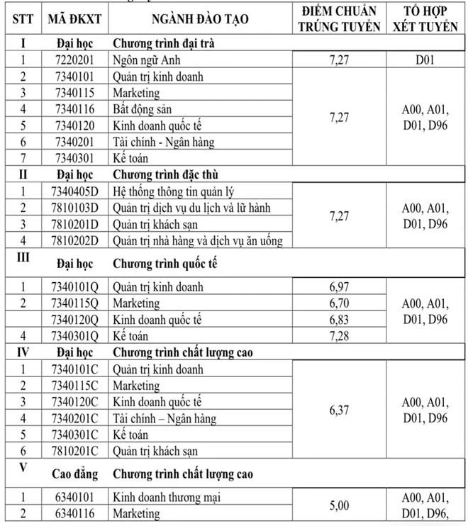 Theo nhà trường, tổng số thí sinh trúng tuyển đợt này là 2.420 em. Đối với những ngành còn chỉ tiêu sau khi xét tuyển học sinh giỏi, điểm chuẩn được xác định theo từng ngành. Cao nhất là quản trị nhân lực với 27,5 điểm; các ngành điểm thấp nhất ở mức 20 điểm.
