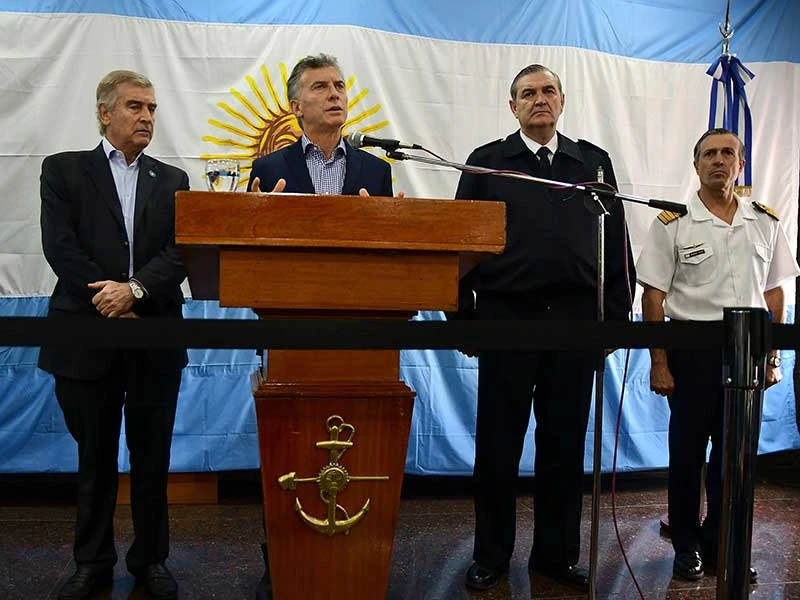 Tổng thống Argentina Mauricio Macri (giữa) trong cuộc họp báo tại căn cứ Mar del Plata, nơi mà tàu ARA San Juan lẽ ra phải cập bến vào ngày 19-11. Ảnh: CLARIN