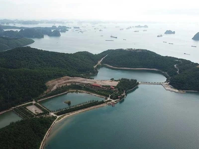 Đảo Thẻ Vàng giữa vịnh Bái Tử Long nhìn từ trên cao như một đại công trường với hàng loạt công trình quy mô được ông Tô Văn Chương (trú TP Cẩm Phả) đổ tiền đầu tư.