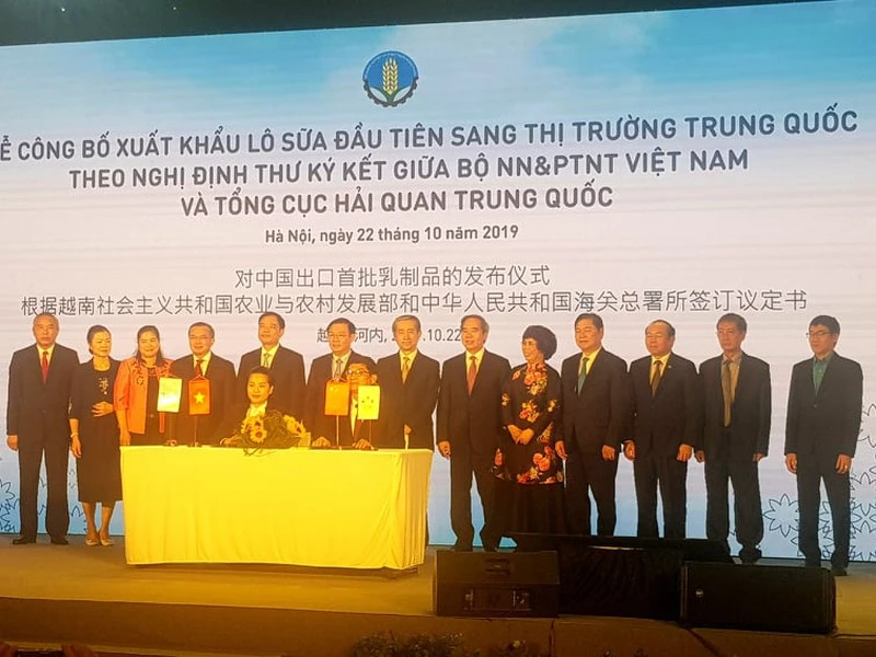 Lễ ký hợp đồng xuất khẩu lô sữa đầu tiên giữa Công ty Sữa TH và đối tác Trung Quốc. Ảnh: AH
