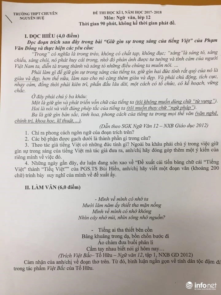 Cụ thể, trong phần đọc hiểu với 4 điểm, đề thi này có nêu: “Đọc đoạn trích sau đây trong bài “Giữ gìn sự trong sáng của tiếng Việt” của Phạm Văn Đồng và thực hiện các yêu cầu:
