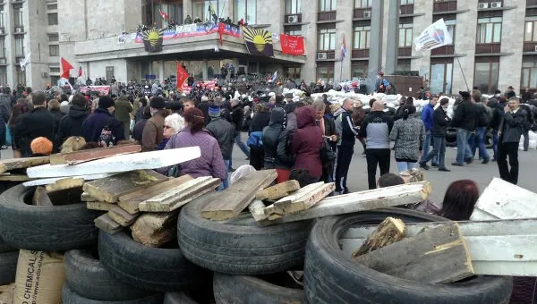 Những người biểu tình chiếm đóng tòa nhà hành chính ở thành phố Lugansk . Ảnh: Ria Novosti