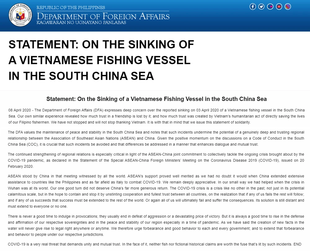 Tuyên bố nêu rõ: "Bộ Ngoại giao Philippines bày tỏ quan ngại sâu sắc về vụ việc tàu cá Việt Nam bị (tàu hải cảnh Trung Quốc) đâm chìm ở biển Đông được báo cáo hôm 3-4".