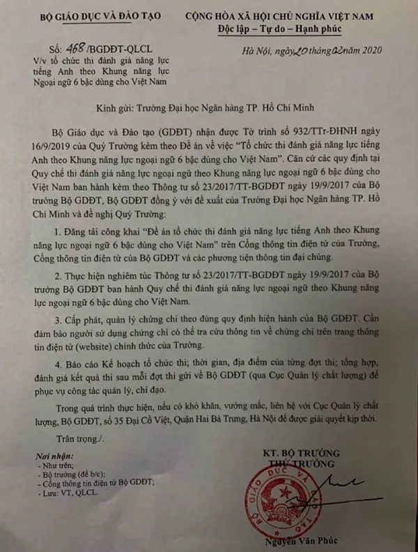 Ngày 20-2, Bộ GD&ĐT đã có văn bản về việc đồng ý cho Trường ĐH Ngân hàng TP.HCM được tổ chức thi đánh giá năng lực tiếng Anh theo khung năng lực ngoại ngữ 6 bậc dành cho Việt Nam.