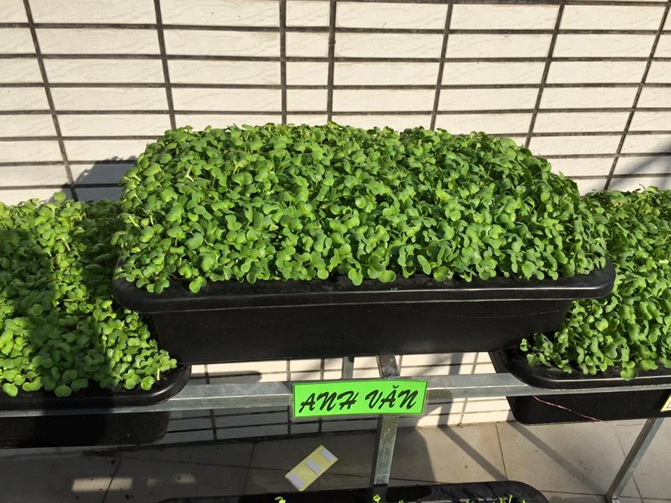 Rau mầm của lớp Anh Văn đã xanh um trong từng thùng.