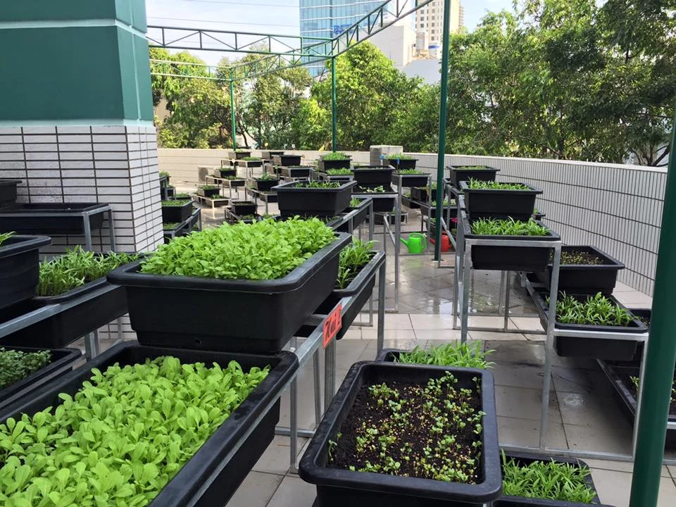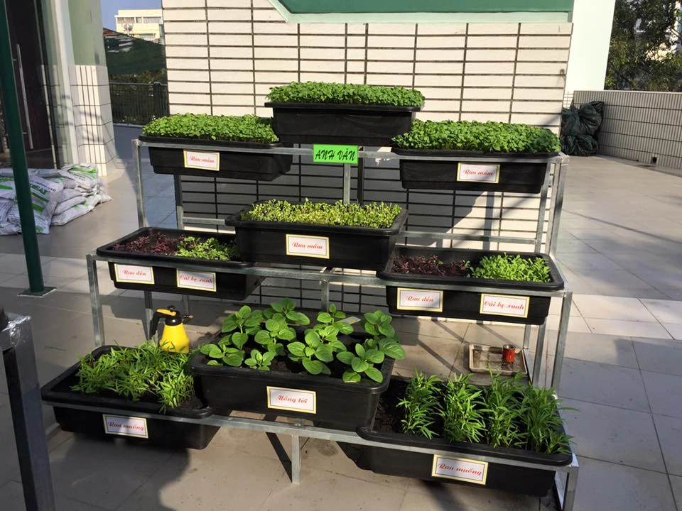 Trường đã tận dụng diện tích hơn 200 m2 trên sân thượng để trồng 288 thùng rau với hệ thống tưới và thoát nước đầy đủ. Mỗi lớp sẽ được chín thùng để trồng các loại rau như rau muống, cải mầm, cải xanh, mồng tơi... Sau gần nửa tháng trồng, các loại rau đã bắt đầu xanh tươi để các cô tách trồng thưa ra.