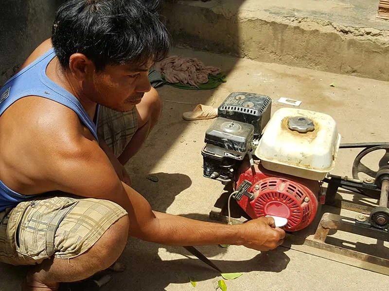 Anh Trần Văn Đến dễ dàng lột nhãn Honda từ chiếc máy bơm nước và cho biết máy liên tục trục trặc. Ảnh: PN