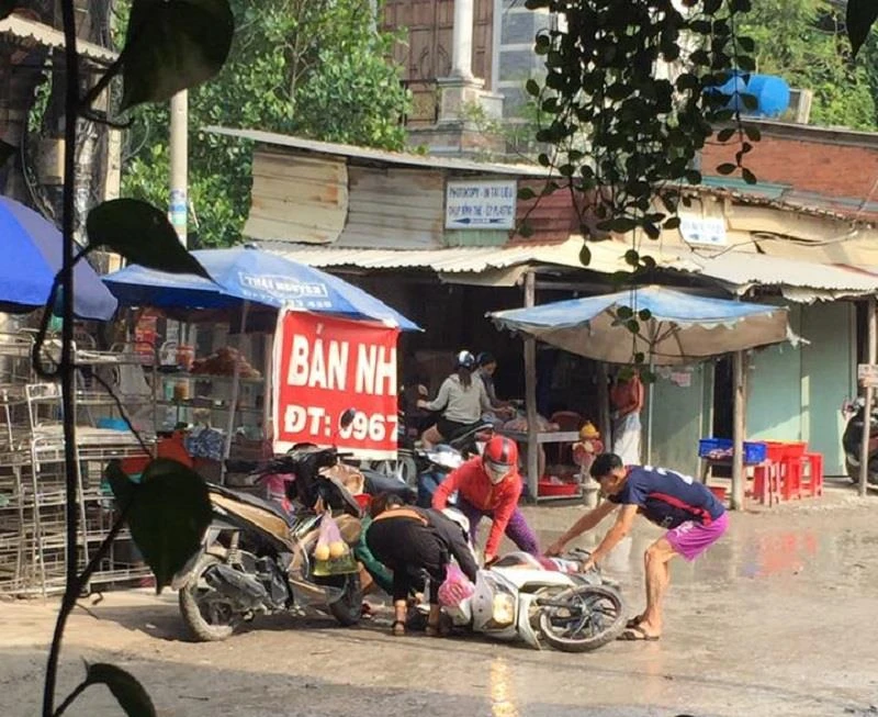 Hai mẹ con chị Bảo Ngọc té ngã ở ngã tư Toàn Trung.