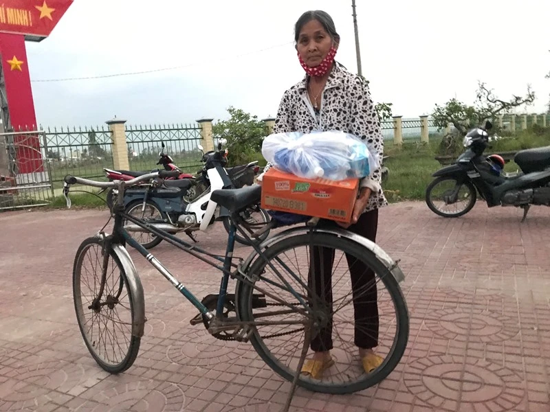 Bà Phạm Luyện đạp xe gần 10 km đi nhận quà hỗ trợ. Ảnh: HÀ HẢI