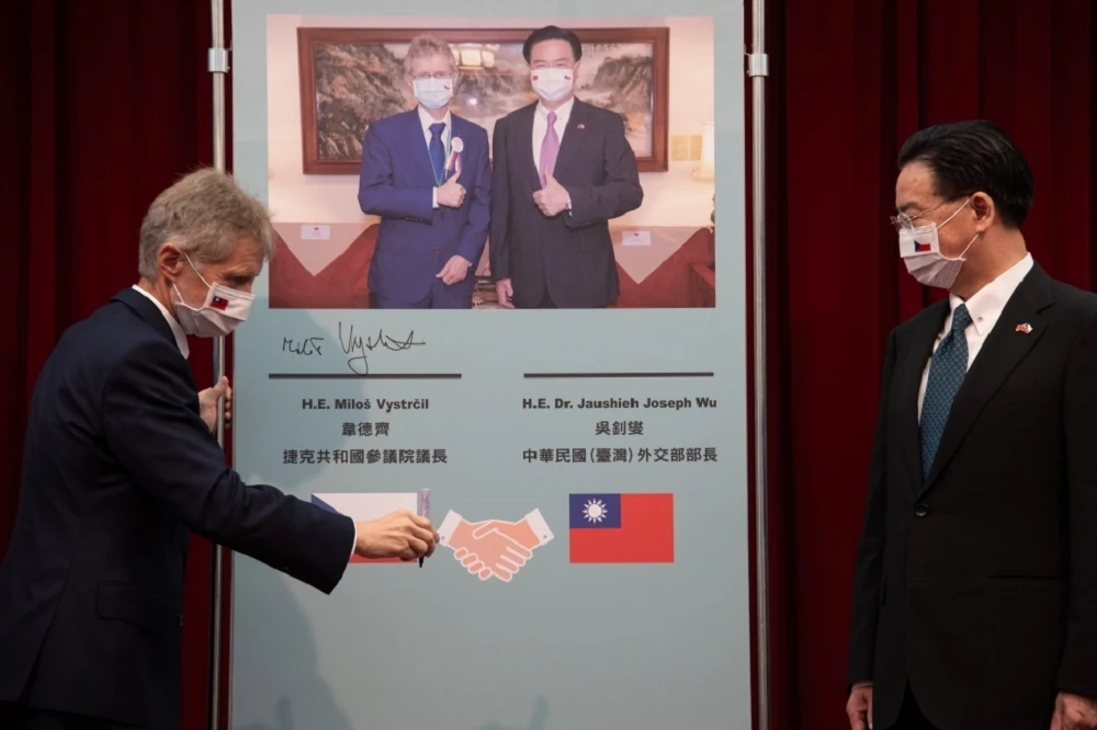 Người đứng đầu Cơ quan đối ngoại Đài Loan Ngô Chiêu Nhiếp và Chủ tịch Thượng Viện Séc Milos Vystrcil. Ảnh: JIANG YINSHAN