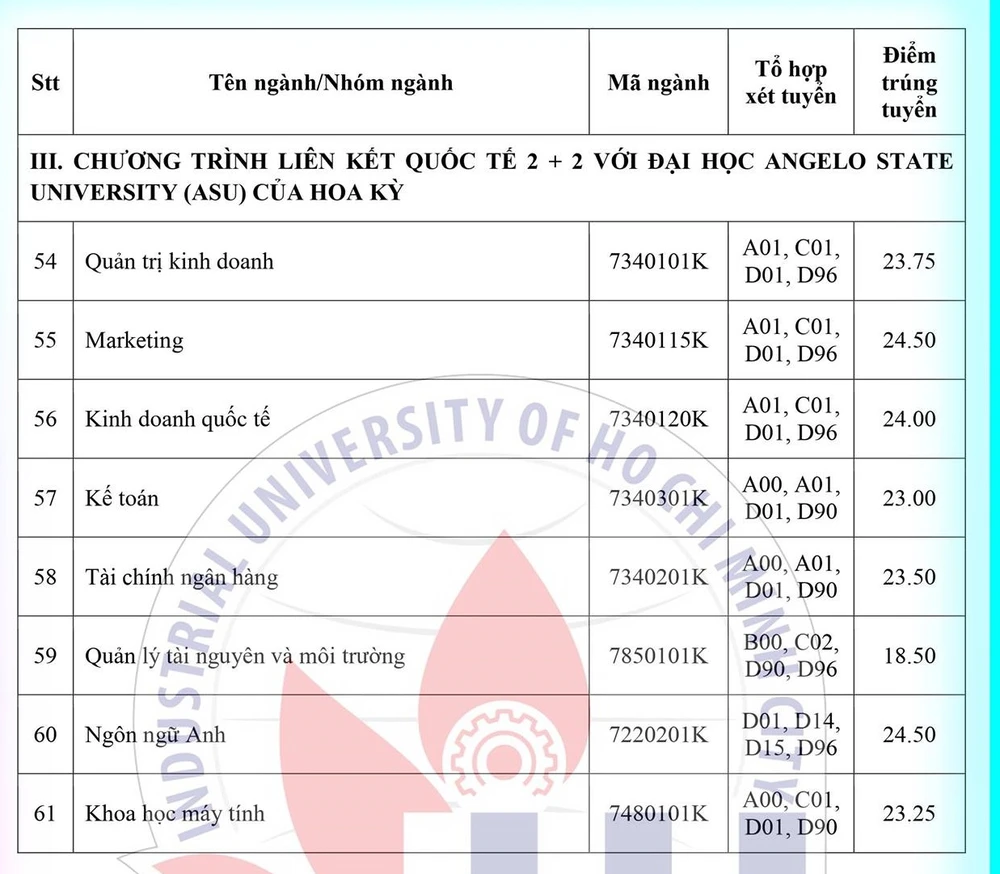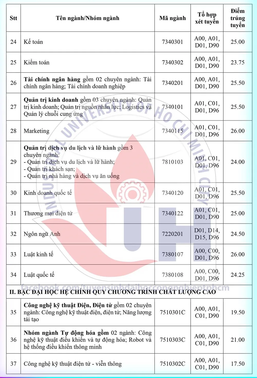 Trong đó, cao nhất vẫn là ngành Marketing với 26 điểm. Một số ngành có điểm chuẩn trên 25 như Công nghệ kỹ thuật ô tô, nhóm ngành Công nghệ thông tin, Quản trị kinh doanh, Kinh doanh quốc tế…