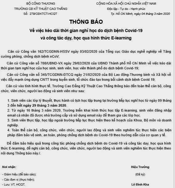 Sáng 4-3, hai trường CĐ tại TP.HCM đã có thông báo đến sinh viên về việc kéo dài thời gian nghỉ học đến hết tháng 3 để phòng tránh dịch bệnh. Đó là Trường CĐ Công nghệ Thủ Đức và Trường CĐ Kỹ thuật Cao Thắng.