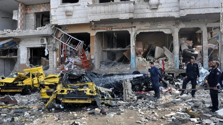 Hiện trường vụ đánh bom kinh hoàng ở TP Homs (Syria) ngày 21-2. (Ảnh: CNN)