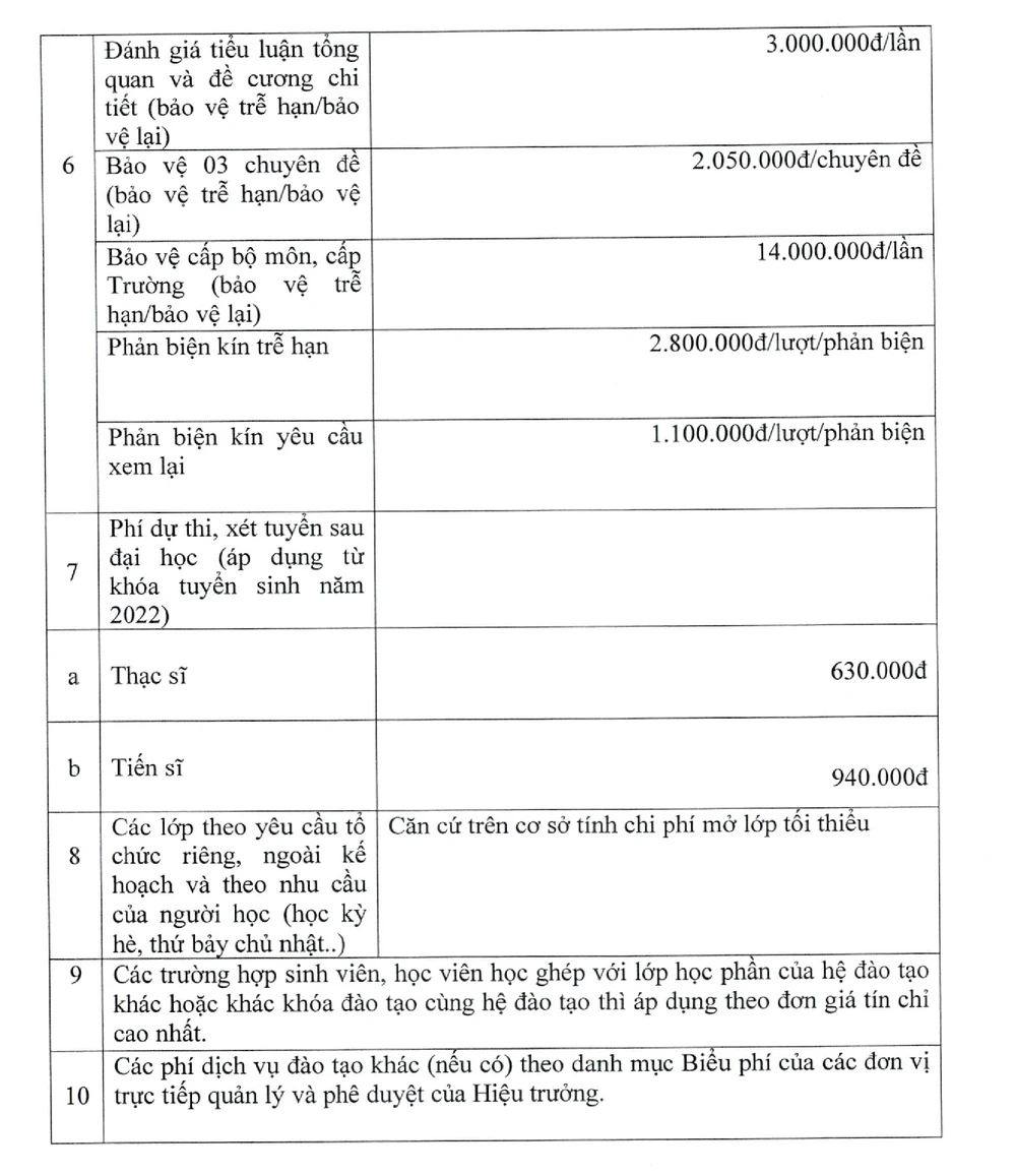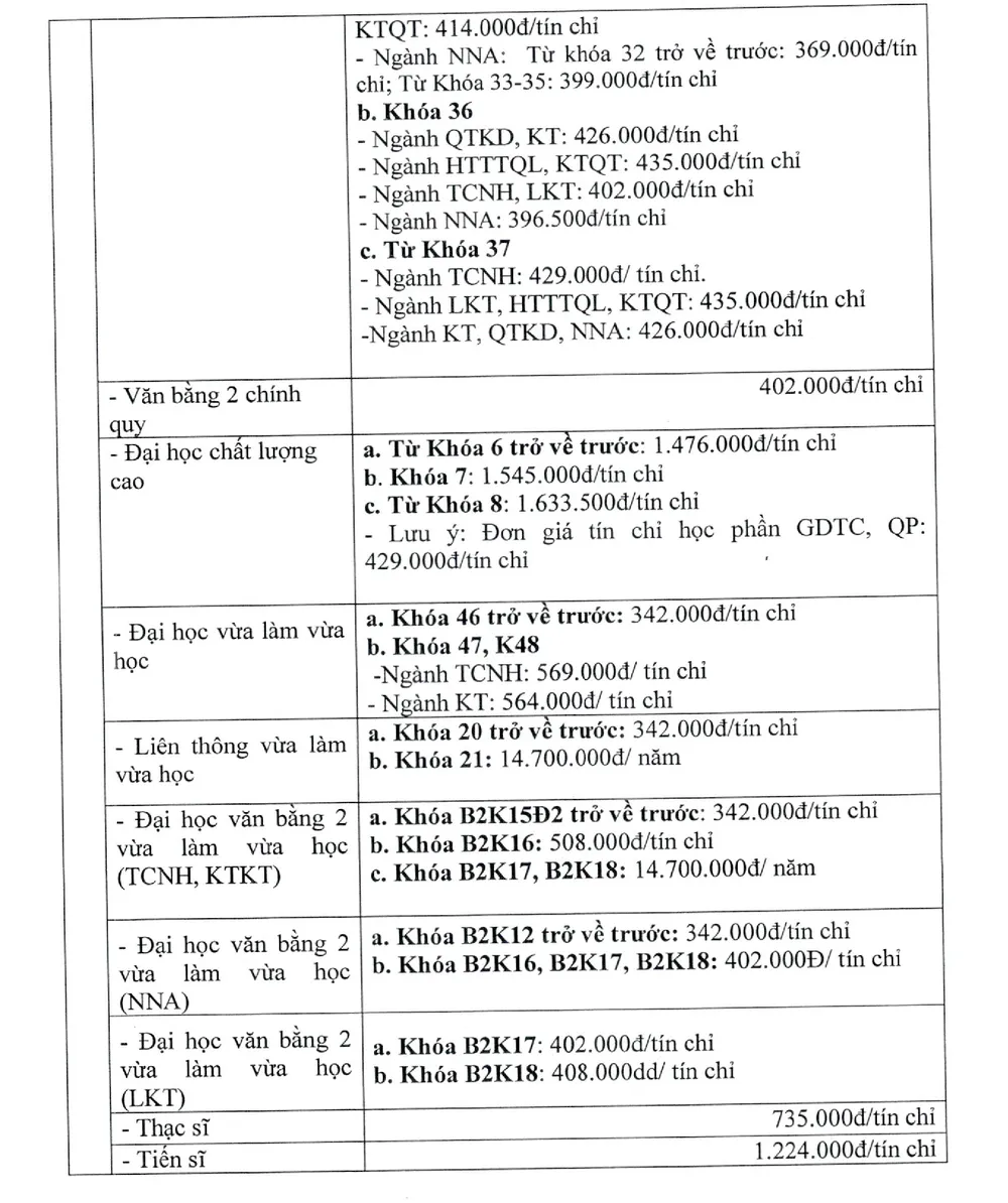 Cụ thể, ở hệ đào tạo ĐH chính quy, khóa 35 trở về trước có mức thu mới là 246.500 đồng đến 276.000 đồng/tín chỉ, tùy ngành và tùy khóa học. Học phí khóa 36 từ 264.500 đồng đến 290.000 đồng/tín chỉ. Khóa 37 có học phí từ 284.000 đồng đến 290.000 đồng/tín chỉ.