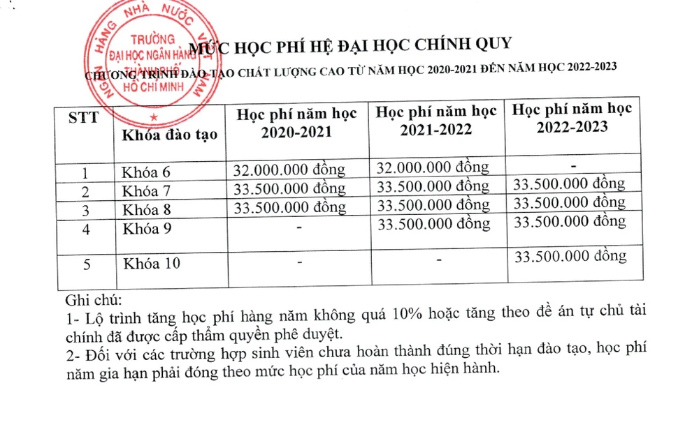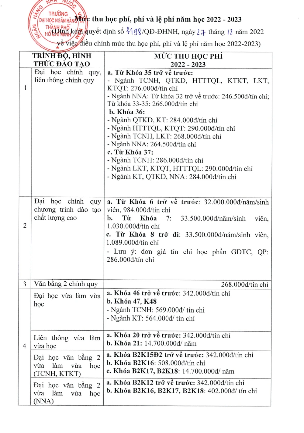Trường ĐH Ngân hàng TP.HCM vừa có thông báo điều chỉnh mức thu học phí năm học 2022-2023 cho các khóa đào tạo, hệ đào tạo hiện nay tại trường.