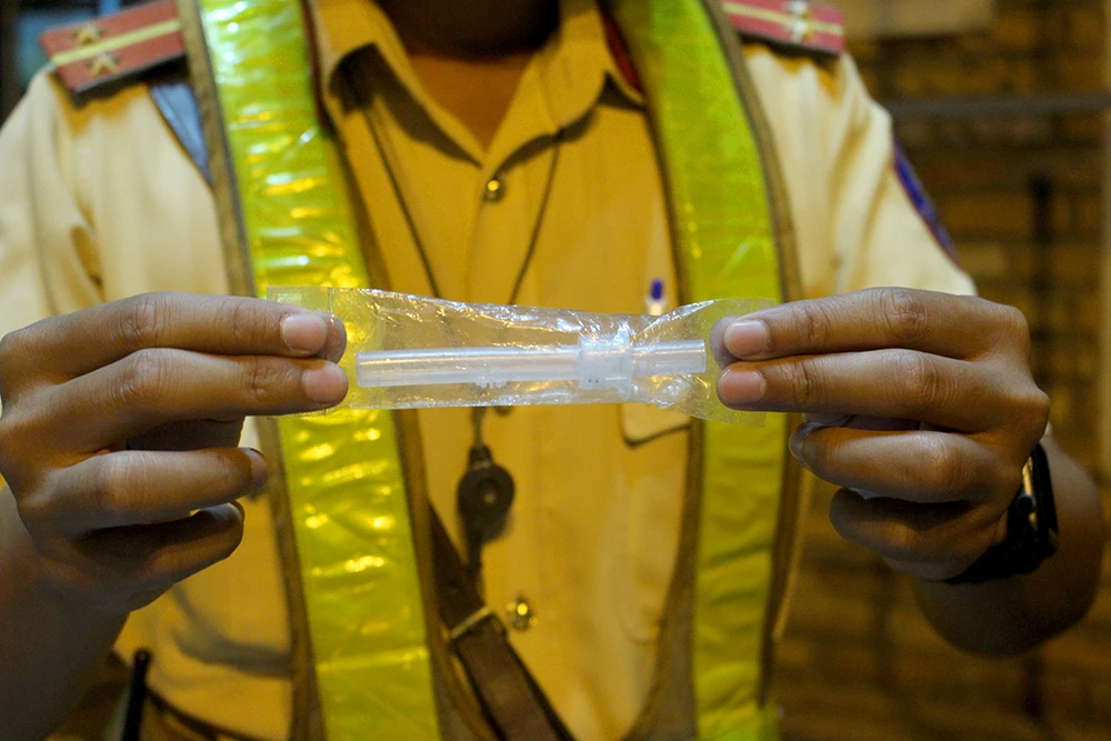 Sau đó, một ống thổi mới được CSGT lấy ra, bóc lớp nylon bên ngoài, gắn vào máy đo nồng độ cồn và nói với người dân rằng đây hoàn toàn là ống thổi mới. Các ống thổi đã qua sử dụng được CSGT cất vào một túi riêng.