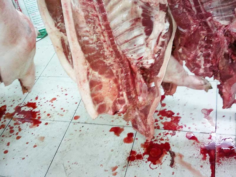 Một vụ heo bơm nước bị bắt quả tang và thịt heo bơm nước đang rỉ dịch khi treo lên. Ảnh: TRẦN NGỌC