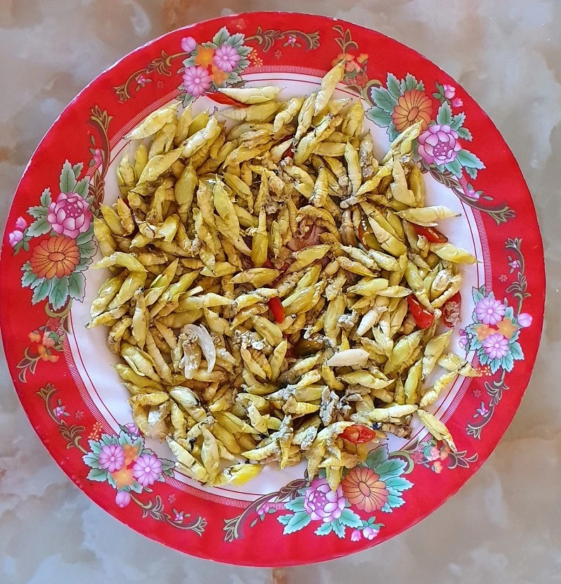 Nhộng sâu chuyển sang màu vàng với mùi vị hấp dẫn.