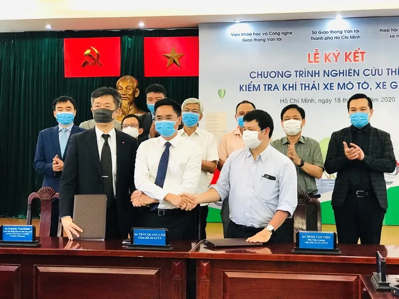 Sở GTVT TP.HCM cùng các đơn vị ký kết nghiên cứu thí điểm kiểm tra khí thải xe mô tô, xe gắn máy. Ảnh: THU TRINH