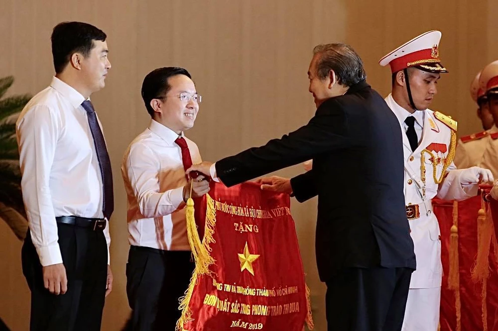 Phó Thủ tướng Thường trực Chính phủ Trương Hòa Bình trao cờ Đơn vị xuất xuất trong phong trào thi đua 2019 cho Phó GĐ Sở TT&TT TP.HCM - ông Từ Lương. Ảnh: HOÀNG GIANG