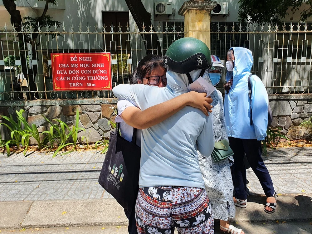 Một thí sinh ôm mẹ khóc khi rời khỏi điểm thi. Ảnh: T.AN