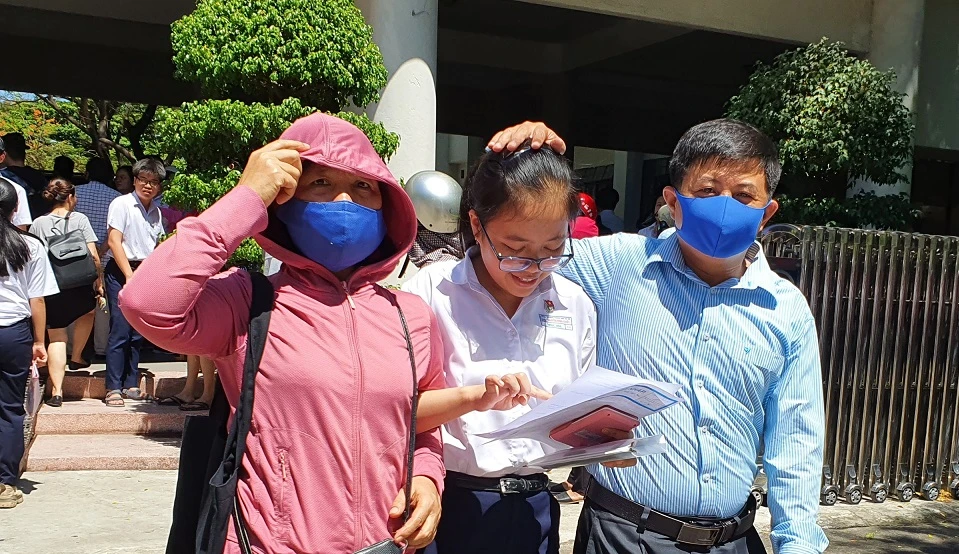 Sáng 19-7, các thí sinh thi vào lớp 10 tại Đà Nẵng đã hoàn thành xong bài thi môn Toán. Thời tiết nắng nóng nhưng rất nhiều phụ huynh vẫn cố nán lại ngoài điểm thi để chờ con.
